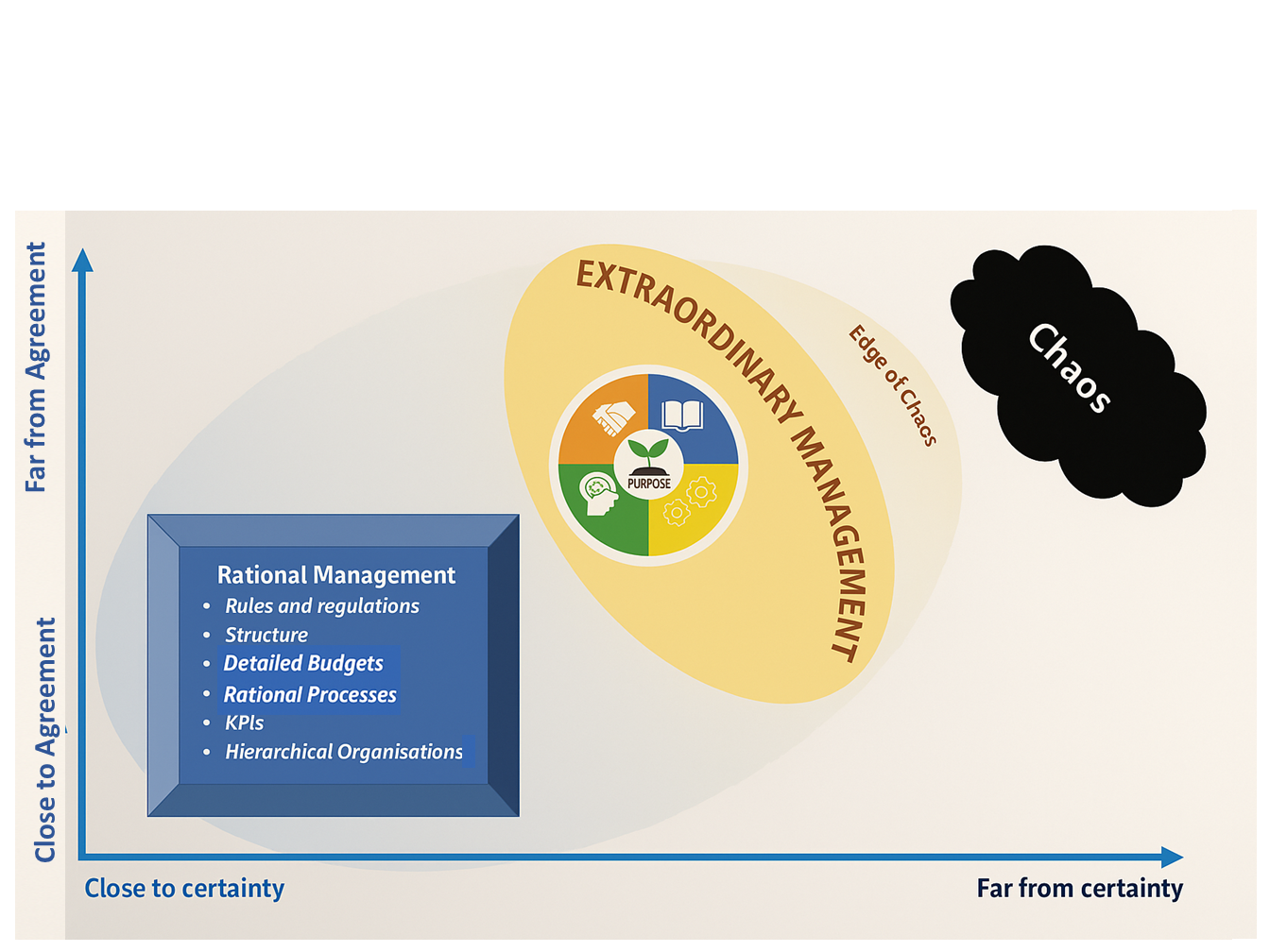 • Close to certainty, close to agreement – the domain of classical management. Here we can plan, measure, and optimise. Efficiency reigns.