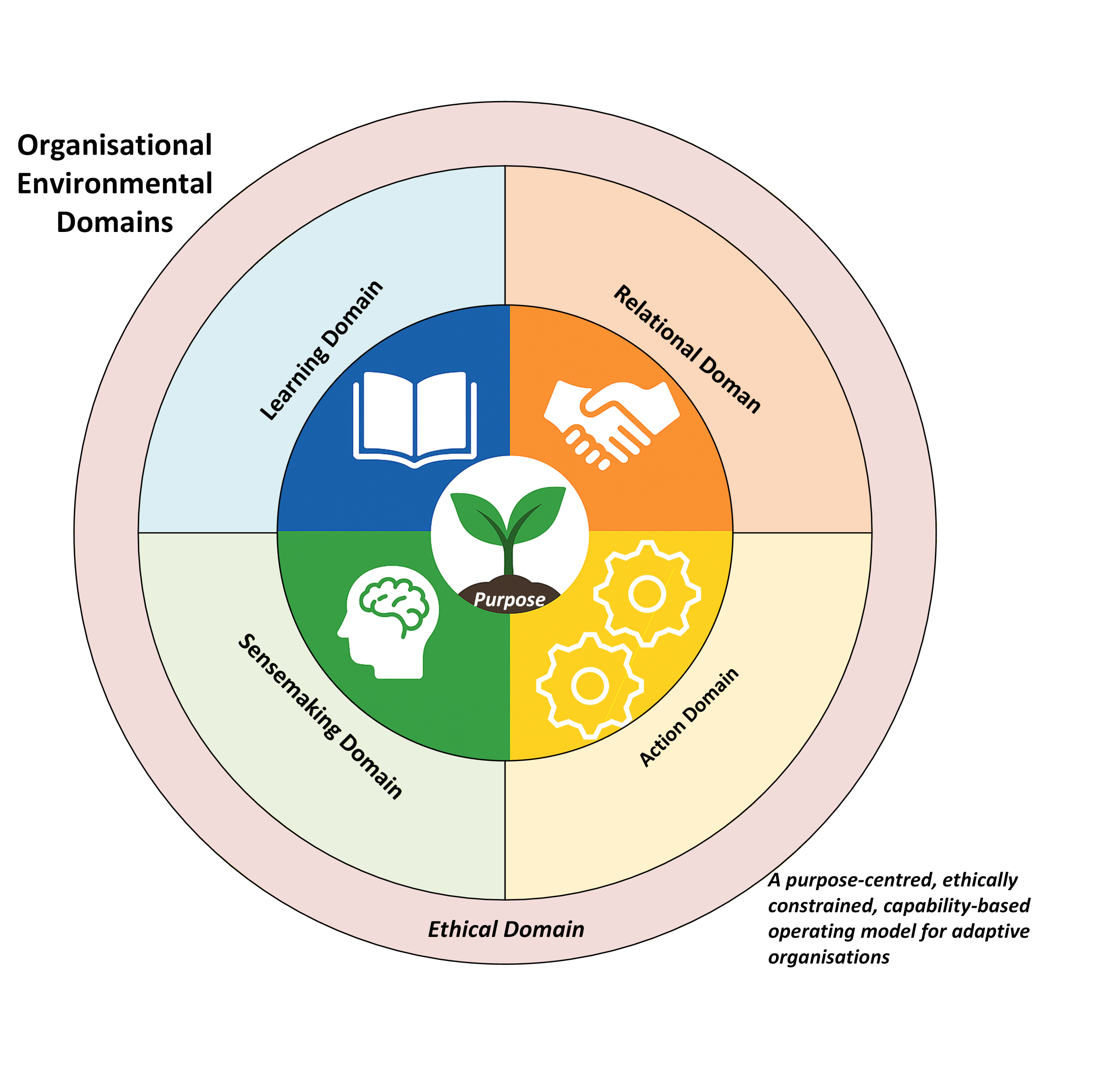 Purpose sits at the centre of this model β€” orienting action, shaping judgement, and aligning the system as a whole.